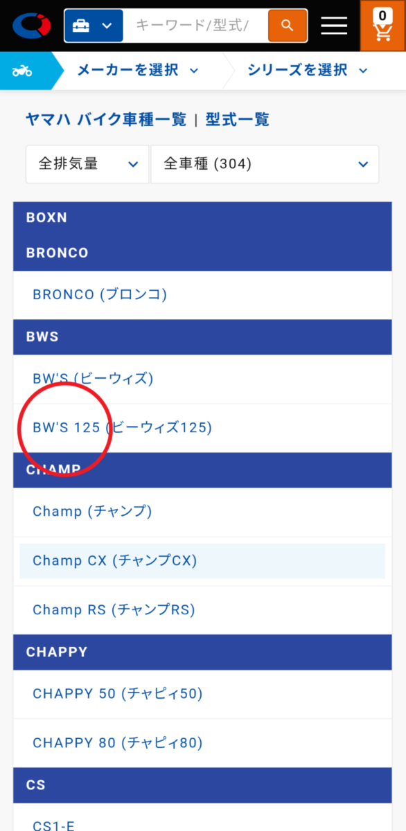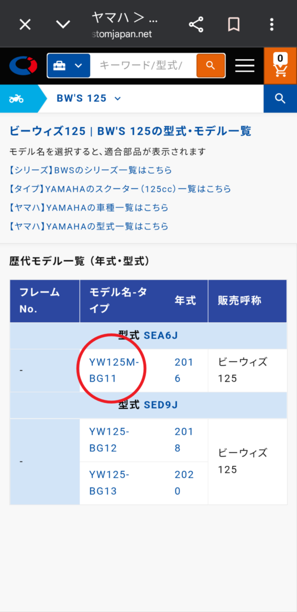 ③年式ごとの形式番号が表示されるので、自分のバイクの形式番号をタップ。