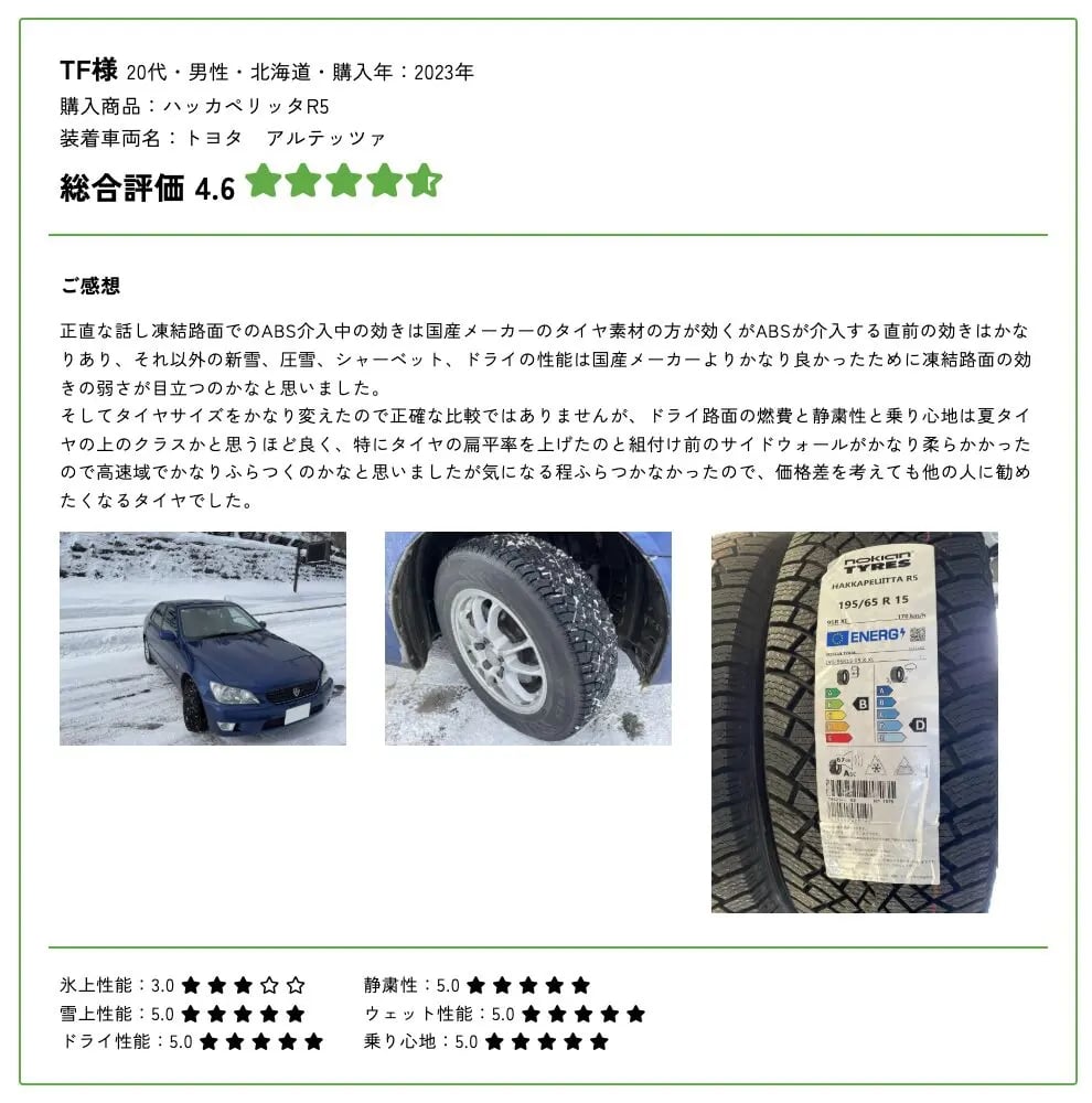 高速&ドライの道路を約4万㎞、雪道を約8,000㎞走ってもプラットフォーム(使用限度)が出ず驚きました。国産スタッドレスならこの距離はまずもちません。片道300㎞のスキー場に30回は行くのでワンシーズンで終わりです。しかも値段が高く、約22万円×5年で110万円。その額はとても出せません…。私の使い方だとコスパがいいハッカペリッタじゃないと無理ですね。」