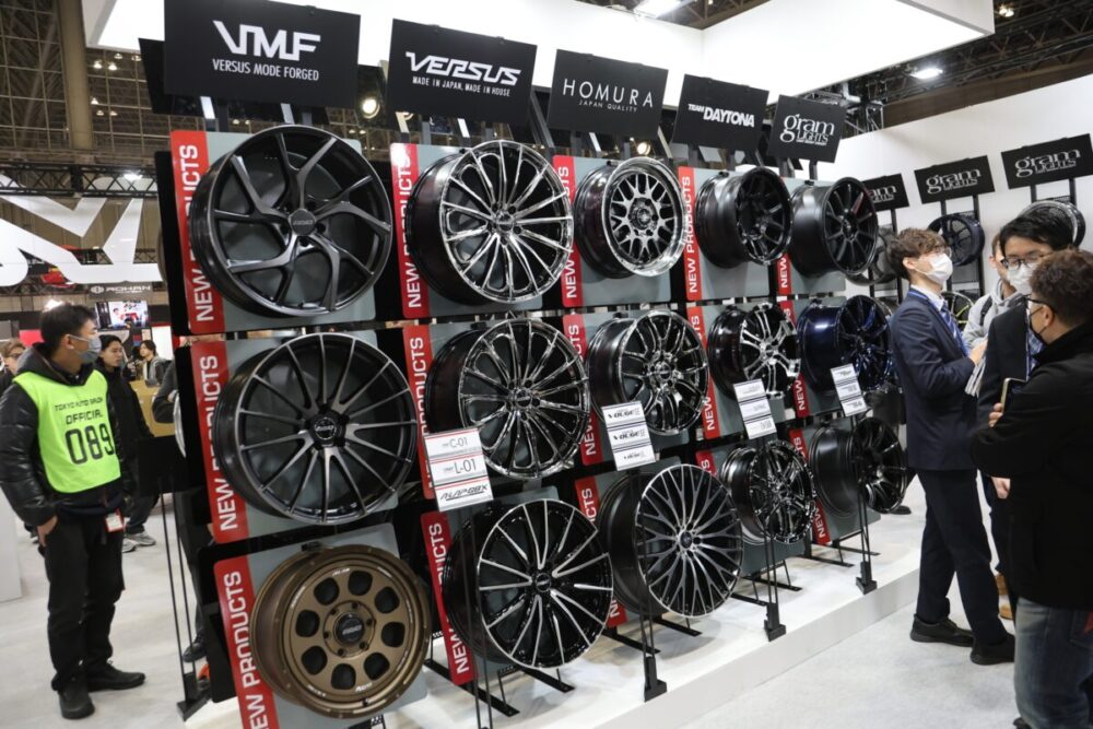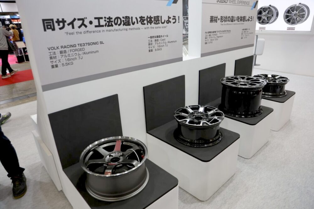 ホイールは見た目の印象をガラッと変えるだけでなく、軽さや剛性(たわみにくさ)次第で、ハンドリングの軽さや乗り味にも影響が出るパーツだ。だからこそ“いいホイール”を作れるメーカーのブースは、カスタム初心者にとって最高の教科書になる。