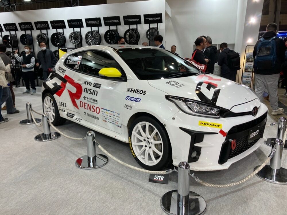 57TR RALLYだ。このホイールは全日本ラリー選手権 JN2クラス モリゾーチャレンジカップ指定部品。写真のGRヤリス GR4RALLY DATに装着された白いホイールがそれだ(反対側には57TRを装着)。