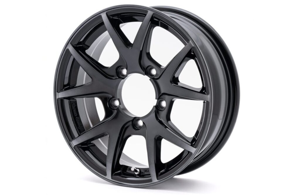 ノーマルジムニーのホイールと同様10本スポークとしつつ、外側に向けてスポークをテーパーさせることでシャープなイメージを作り出す。