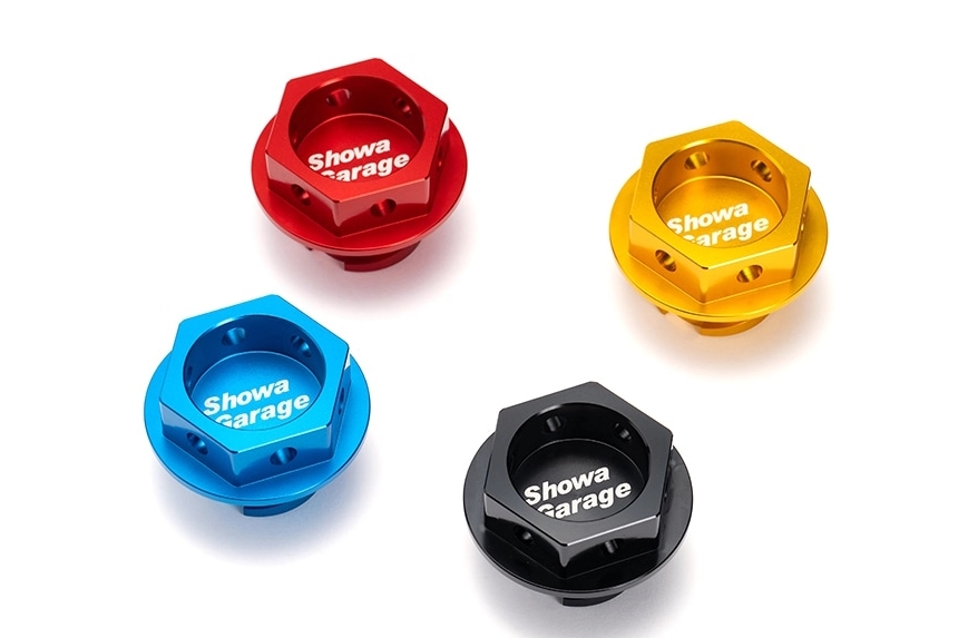 SGR(Showa Garage Racing)ブランドから登場したオイルフィラーキャップは、アルミ削り出しによる高品質な仕上がり。ブラック、ゴールド、ブルー、レッドの4色を展開し、中央にはレーザー加工によるロゴを刻印。ワイヤリング用の穴も設けられており、見た目だけでなく競技使用にも耐える設計となっている。今後はさらに新色の投入も予定されている。
