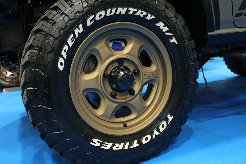 シャープな10スポークデザインとコンケープ形状により、ジムニーの足元を引き締める新作アルミホイール。リムにはクロスローレット加工が施されており、トラクションを確保してビード落ちを抑止。スタンダードモデルよりもスリムなリム幅5.5J設計を用いることで、障害物などとの接触によるホイールリムのダメージ防止も狙っている。フローフォーミング製法により、鋳造でありながら鍛造に近い緻密な金属組織を形成。高強度かつ軽量なのも大きな特徴だ!