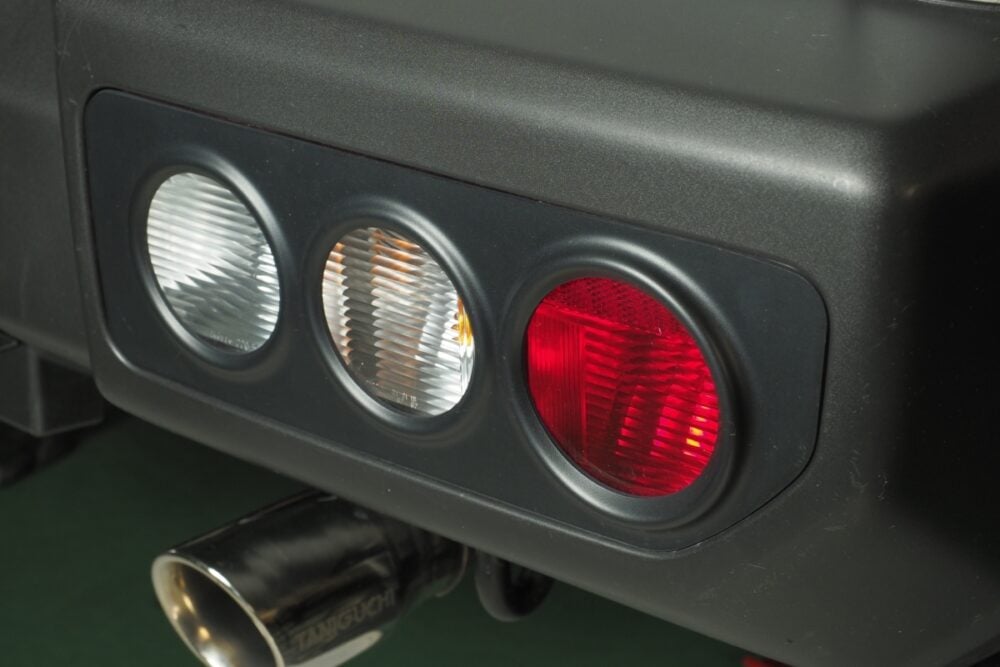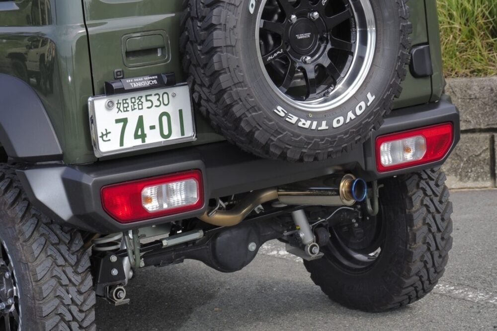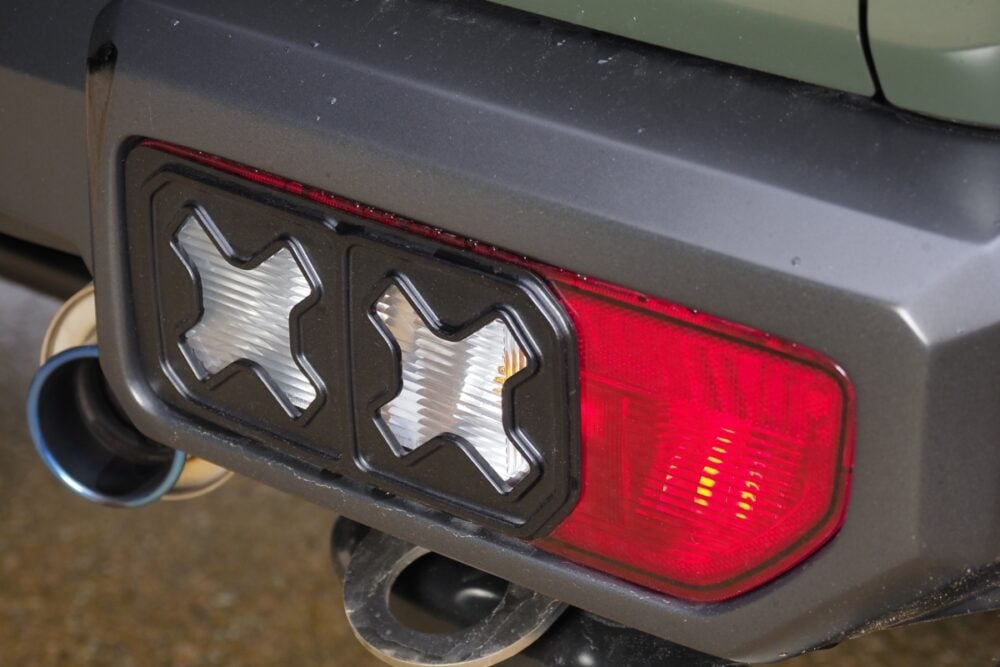 リア角バンパーは、JA系で定番の小型テールランプを使用。旧規格ジムニーのカスタムで定番だったあの雰囲気を、現行で再現できる。JB64にはオプションでバンパー下部にナンバープレートを移設できるブラケットも用意。ゲート移設が定番になりがちなところを、オーナーの“やりたいスタイル”で選べる余白が残されている。エッジの効いた造形はフロントとのマッチングも良好だ。