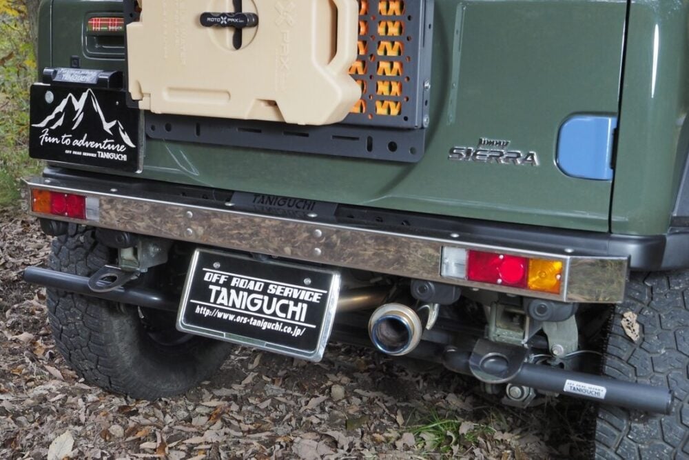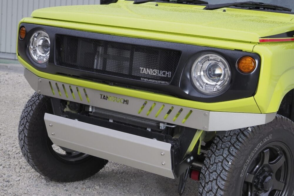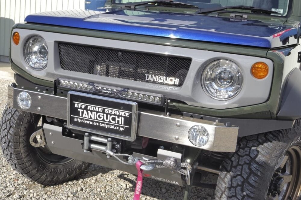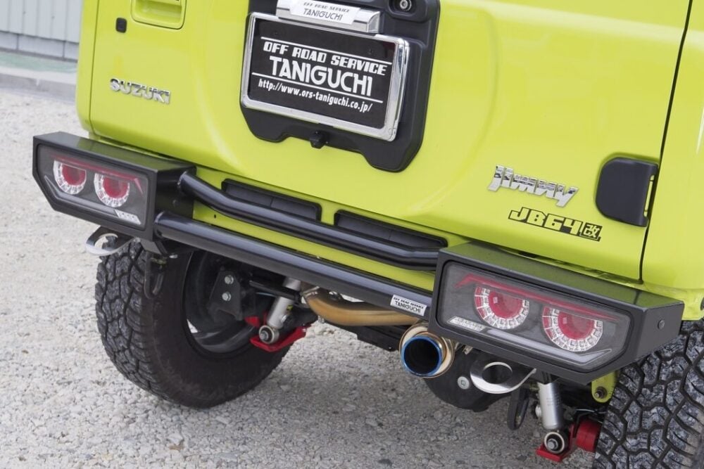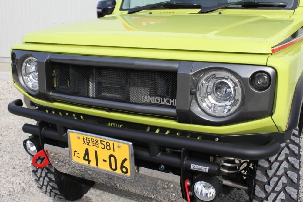 一昔前の四駆のバンパーは、樹脂製ではなくスチール製の角パイプ状で、シンプルなものが主流だった。その空気感を現行ジムニーに持ち込めるのが、タニグチの角バンパーである。