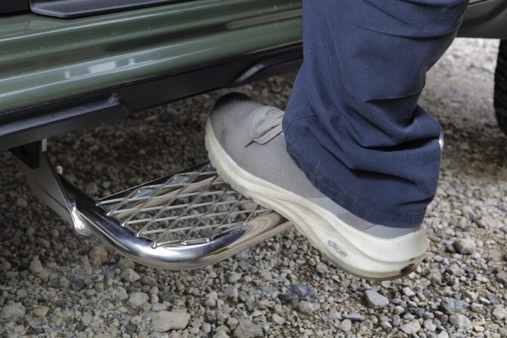 一般的にサイドステップは、ルーフラック装着時の足場や、リフトアップ後の乗降を補助する目的で使われる。しかし、オフロードサービスタニグチのサイドステップはそれだけではない。最大の特徴はメッシュ構造であること。靴底についた泥や雪を踏み落とせるため、車内を汚さずに済むのだ。冬のアウトドアシーンでは特に重宝するアイテムである。コンパクトなサイドステップと、ボディと一体感のあるバータイプの2種類が用意されている。