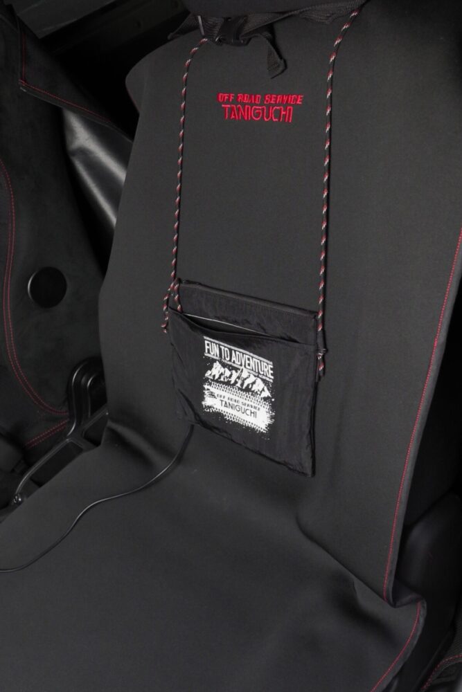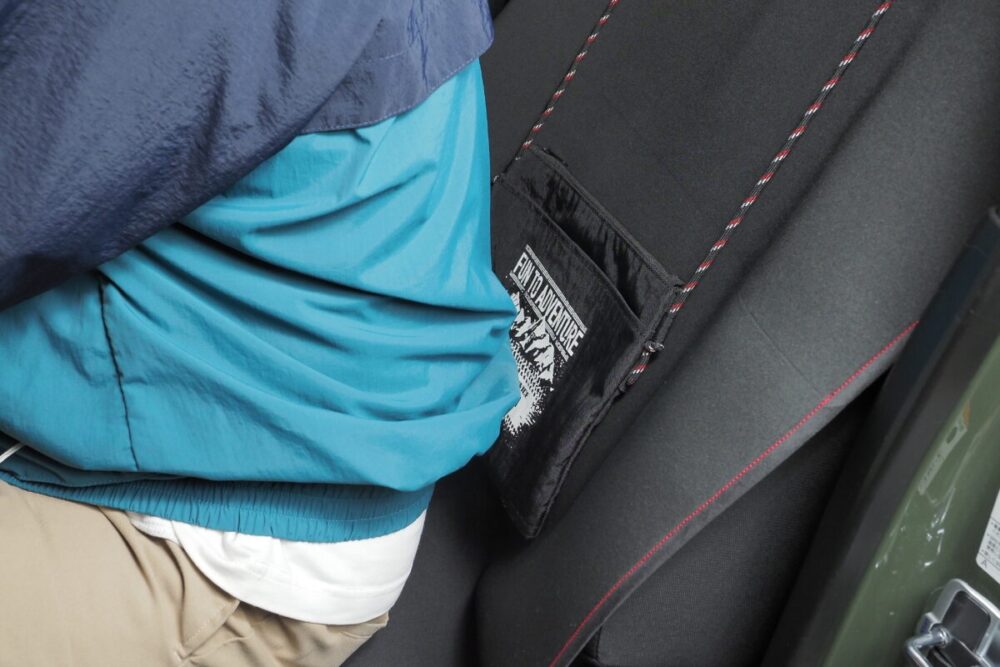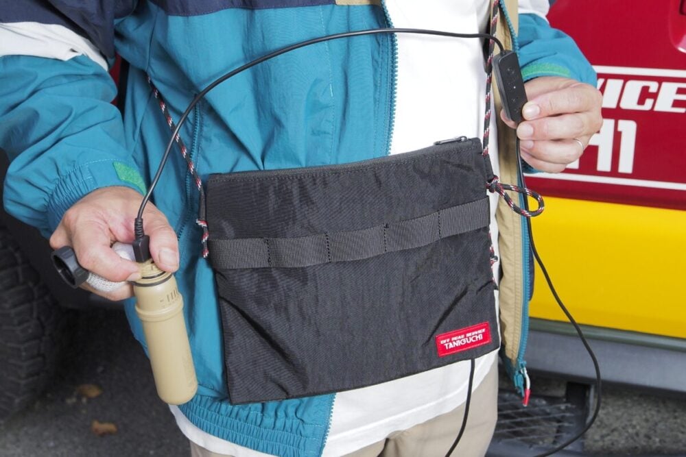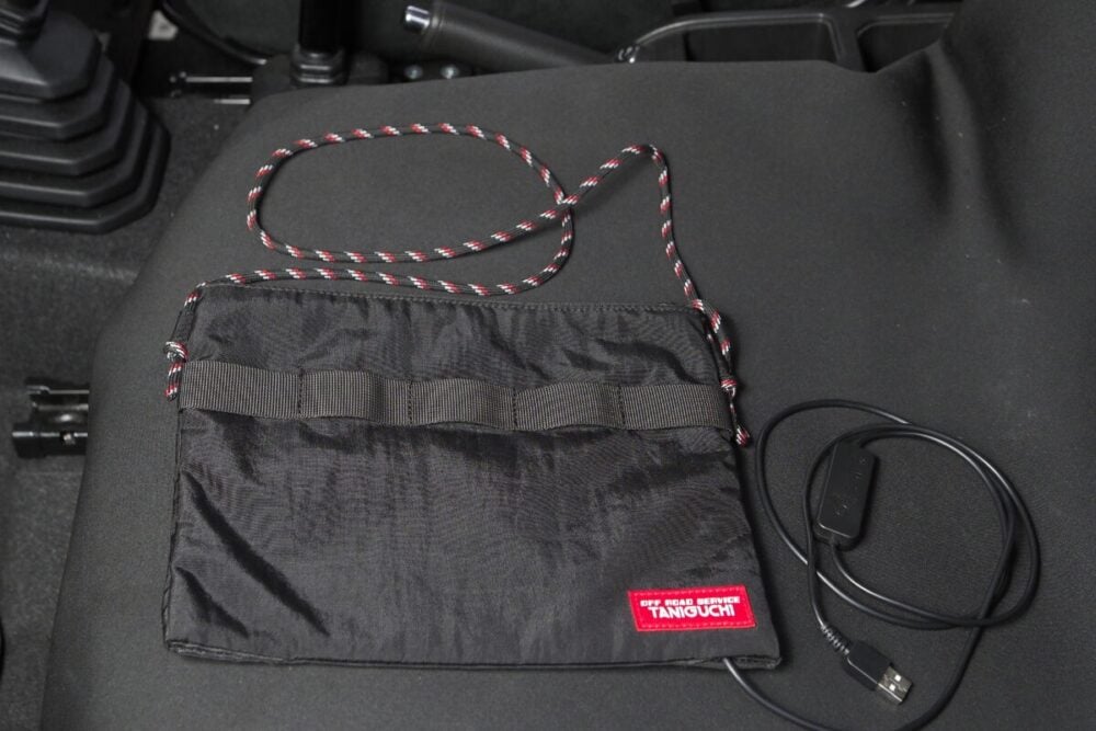 ちょっとした荷物を入れる定番アイテム、サコッシュにもタニグチ流の工夫が光る。超薄型ヒートパッドを内蔵し、モバイルバッテリーを接続すれば発熱してしっかり暖かい。さらに車内ではUSB接続してシートヒーターとして使用可能だ。現行ジムニーの純正シートヒーターは座面のみを温める構造だが、このサコッシュなら腰もポカポカ。ロングドライブ時の快適性が格段に向上する。