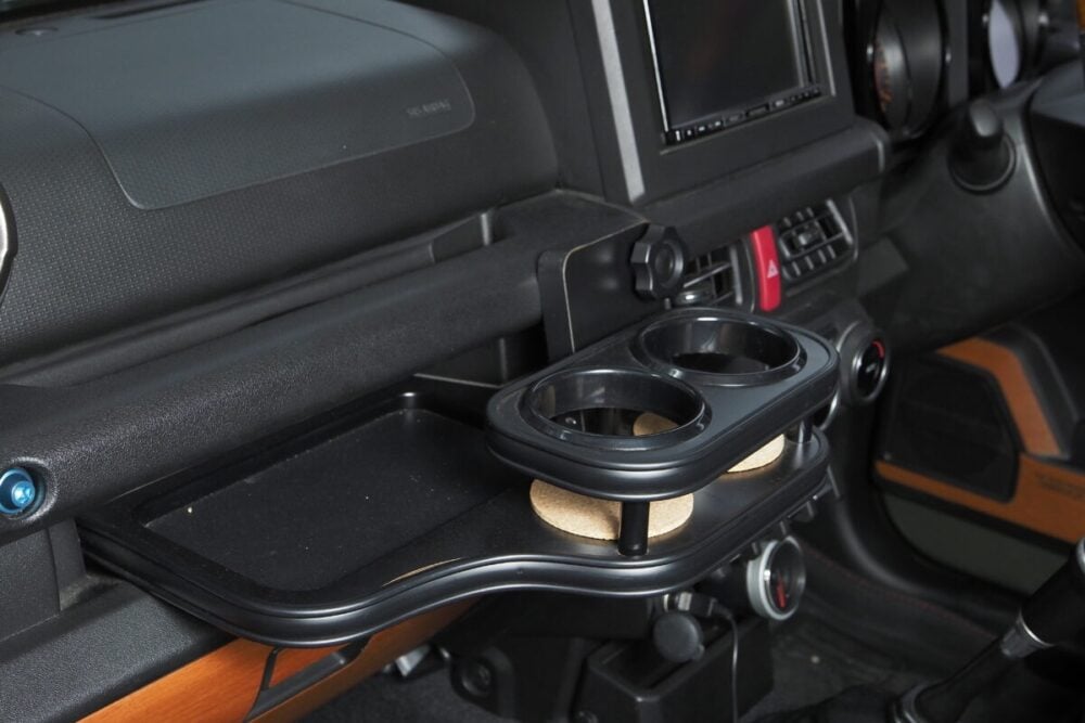 そして最後に紹介するのが、使い勝手抜群のドリンクホルダー。2本のドリンクを収納できるだけでなく、背面にはスマートフォンや小物を置けるスペースを確保。滑り止めシート付きで走行中でも安心だ。助手席での喫煙や車中泊時の小物置きにも便利で、取り付けは加工不要のボルトオン式。DIY初心者でも手軽に装着できるのがうれしい。