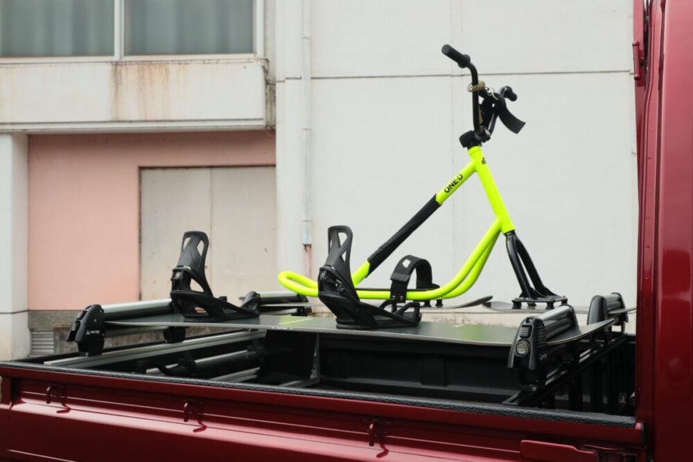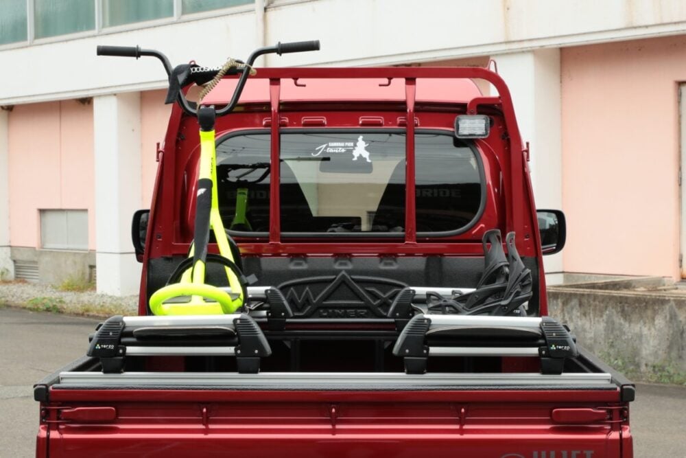 アタッチメントを取り付ければ、軽トラの荷台にスキーやスノボ、自転車も楽々積み込める!