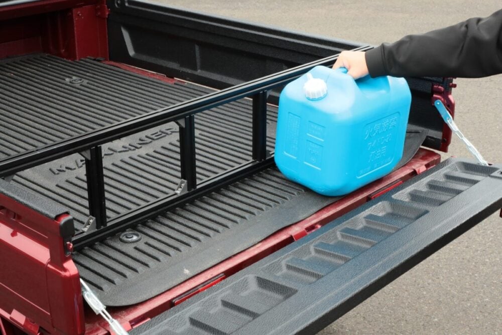 そんなトラレールシリーズのなかでも今回注目したいのが、「荷台セパレーター」だ。搭載した荷物が動かないよう荷台にしっかり固定し、走行中のズレや転倒を防止。ポリタンクや工具ボックスなどを動かないように固定できるアイテムだ。