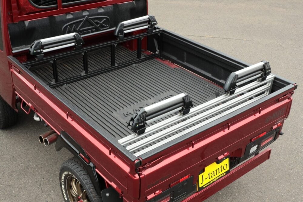 軽トラの荷台の使い勝手を高めるトラレール。その技術を使った「荷台セパレーター」ならば、クルマが動くたびに荷台上を搭載物が動き回るストレスから解放してくれる。加えて、フレームの溝にアタッチメントを取り付ければ、スノボやスキー、サーフボード、自転車などを搭載可能。荷台の上でスッキリ収納でき、実用性と見た目を格段にアップしてくれるはずだ。