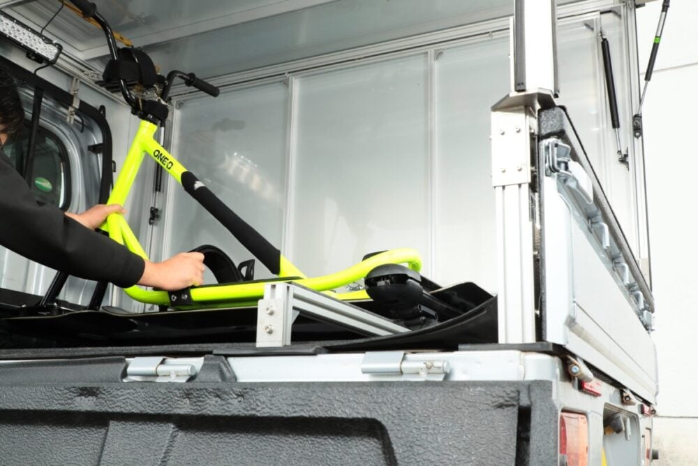 その室内に荷台セパレーターを配置。スノースクートなど背の高いものを載せても、天井に当たらないよう、撮影車両では高さ80mmを使用。荷物を雨風から守れるだけでなく、三方のアオリにはロック機能があるため、盗難される心配もない。