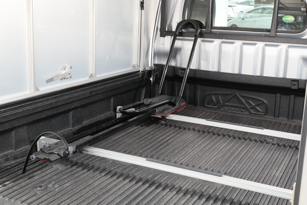 荷台のあおりを立ち上げるだけでキャリアをガッチリと固定するオンリーワンな機構
