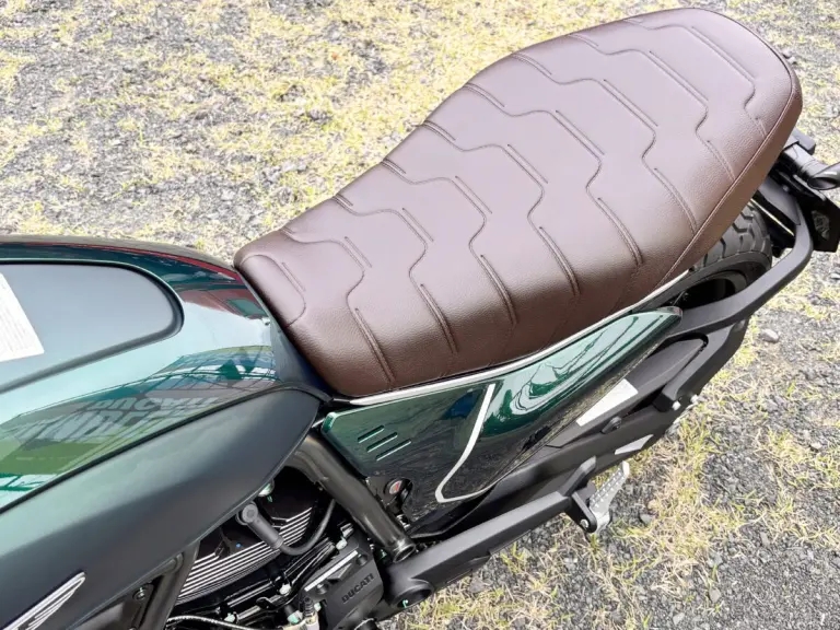スクランブラー ナイトシフトの新色、エメラルド・グリーンは会場での初お披露目となった。伝統的なティアドロップタンクのラインを際立たせつつ、クラシカルな気品と現代的な雰囲気を融合させたカラーリングだ。ブラウンシートとブラックのワイヤースポークが、大人のカフェレーサースタイルをより上質に仕上げている。