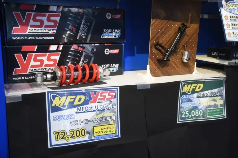 MFDでは、そのKATANAをイメージしたコンプリート車両を販売中。現在、KATANA仕様車はMFD650KATANAと、GSX250RをベースにしたMFD250KATANAを販売している。コンプリートモデルだけでなく、好みのパーツを装着して自分だけのカスタムバイクに仕上げることもできる。その車両も試乗会で乗ることができるというから驚きだ。