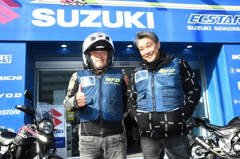 また、2007年より全日本ロードレース選手権GP250クラスに参戦を開始し、現在も全日本JSB1000クラスに参戦中の全日本トップレーサー・渡辺一樹選手も試乗会の先導役として参加することがある。Moto GPへの参戦経験もあり、気さくな性格からファンも多い人気選手だ。長くヨシムラから全日本選手権や鈴鹿8耐に参戦していたこともあり、スズキのトップディーラーであるMFDとは、現在も深い絆で結ばれている。単なる試乗会ではなくトップレーサーと一緒に走った記念にもなるはずだ。