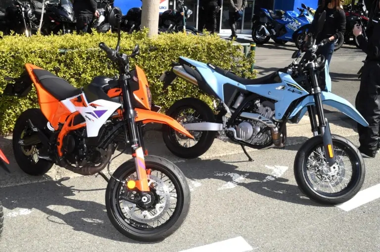 試乗会場には今年発売されたばかりのGSX-8T/TTも試乗車として用意されていた。参加者も興味津々で、走行枠の合間に写真を撮ったりまたがったってポジションを確認する方も多かった。試乗車の人気はフラッグシップモデルのハヤブサと、長距離ツーリングの快適性で高い評価を得ているGSX-S1000GTで、早々に事前予約で走行枠が埋まってしまった。また、直接のライバルとなるDR-Z400SMとKTM390SMCRの乗り比べをする参加者も多かった。