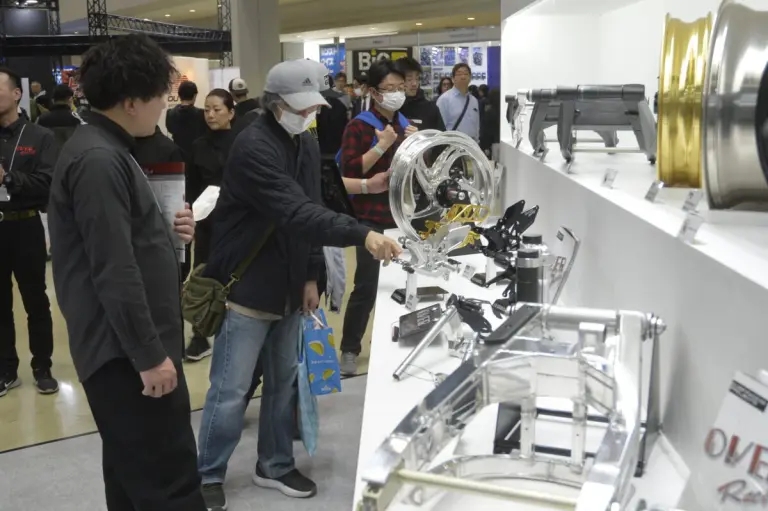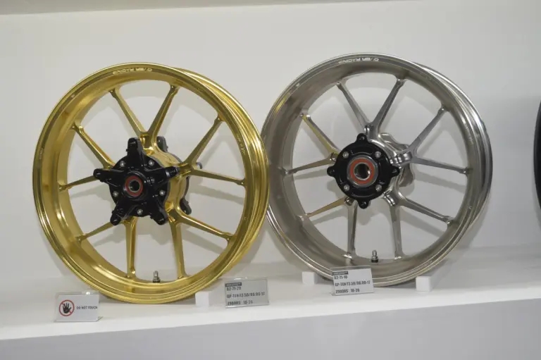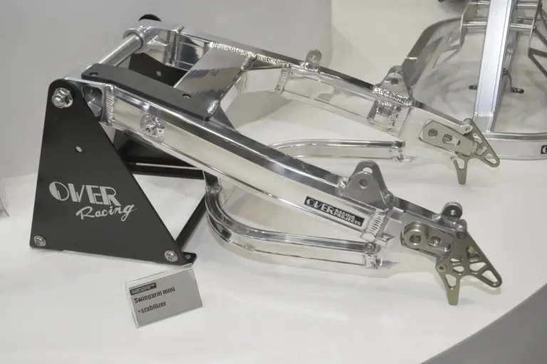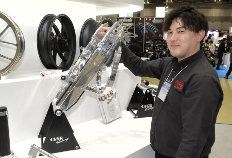 パーツの展示も、実際に触って、その質感や軽さを実感できるよう配慮されていた。特に同社が得意とするスイングアームやホイールなどは、軽量で剛性の高さに来場者が驚く光景も見られ、またがることのできる車両展示とともに、直に体感できる取り組みが好評だった。