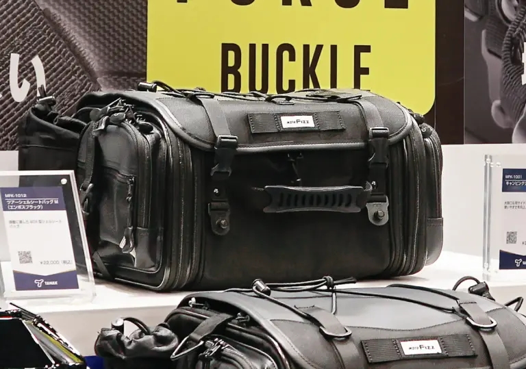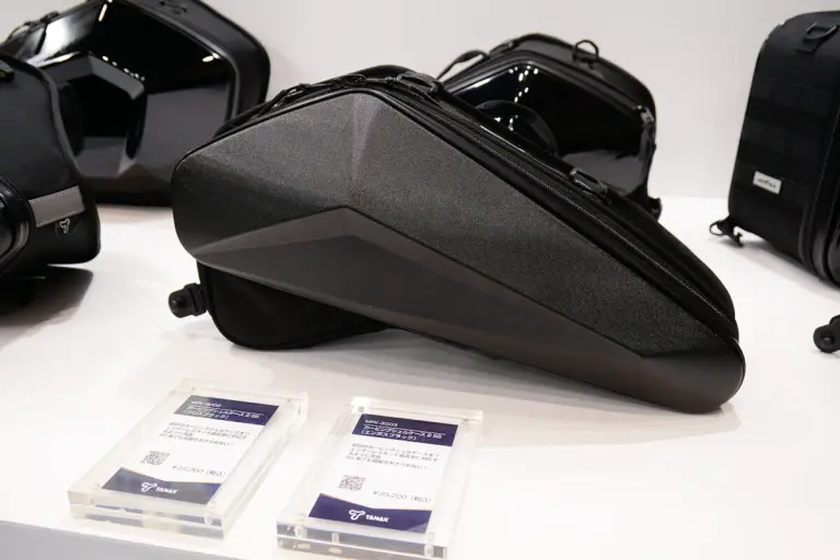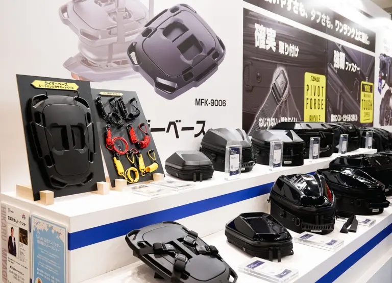 タナックス製品といえば、高品質で高機能かつライダーのかゆいところに手が届く高い利便性もあわせ持つ製品作りで定評があり、今回展示された新作シートバッグやシェルバッグなどもそのひとつ。