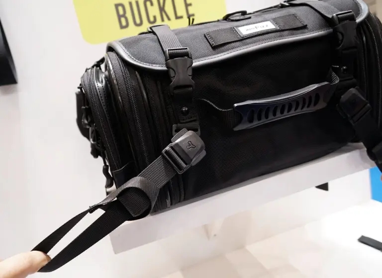 爽快な簡単脱着に加え、取り付け後に起こりうる「車両形状による特有のベルト捻じれ」に接続分が回転することで追従し、ベルトやバッグ本体(バックル装着部周辺)への負担を激減させる。ベルト自体の捻じれやヨレが生じないので、車体取り付け時の見た目が良くなるのも好ポイントだ。