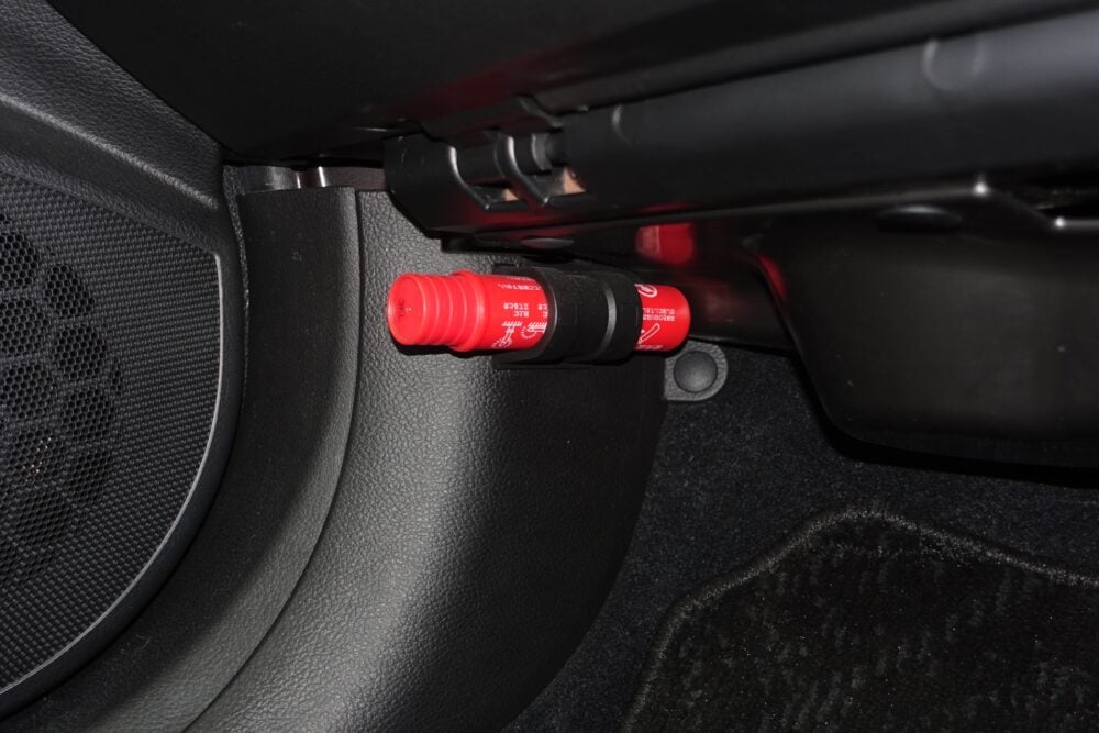 よく「発煙筒」とも呼ばれる「発炎筒」(発煙筒の一種)は、ほとんどの車で手の届きやすい助手席下などに保管されており、助手席に座るときに目にする人も多いです。