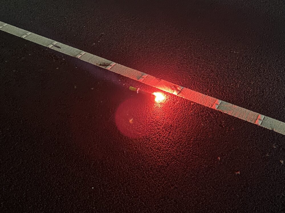 次に、発炎筒を着火して車の後方に設置します。くわえて、三角表示板を置くことで後方にトラブルが発生していることを伝える必要があります。