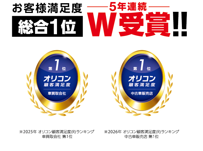 これにより、昨年10月にリリースいたしました、2025年 オリコン顧客満足度調査「車買取会社」での総合1位選出と合わせて、5年連続での2冠達成となりました。