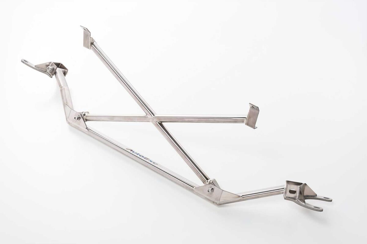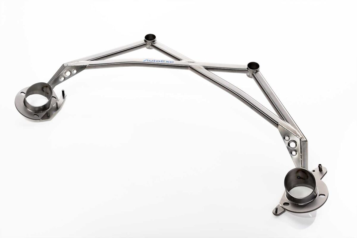 ストラットタワーバーは、1ピース4点式クロスバー構造に、バーリング加工を施したガセットを組み合わせた設計。強固な一体構造で高剛性を確保しながら、重量は2.0kg(純正比約96%)に抑えている。