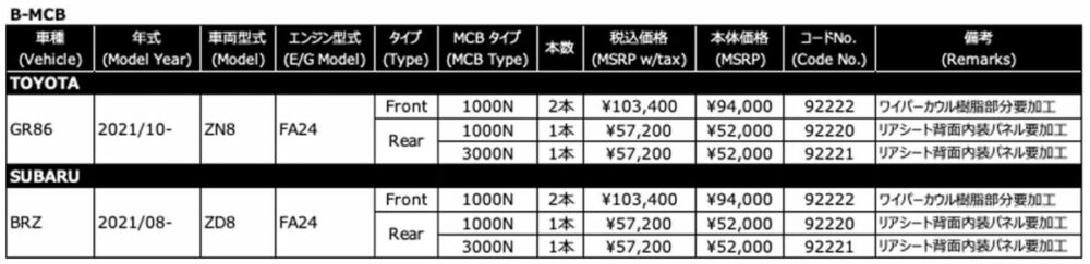 「B-MCB」は、「Motion Control Beam」によるボディ変形の抑制と乗り心地の快適性向上に加え、1台ずつ装着位置や効果の検証を行い、車種毎に専用開発された取り付けブラケット、取付説明書等が付属する車種別専用品です。