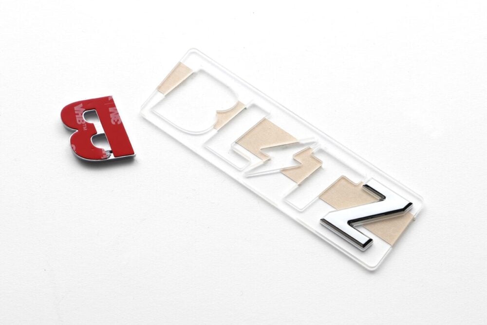 ● 高級感のある樹脂製のブリッツロゴエンブレム。車両への貼り付けも可能です。