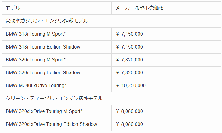 BMW 3シリーズ ツーリングのメーカー希望小売価格(消費税込み)