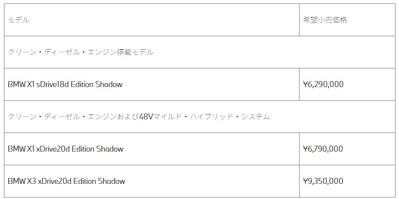 ビー・エム・ダブリュー株式会社は、限定車「BMW X1 sDrive18d Edition Shadow」、「BMW X1 xDrive20d Edition Shadow」および「BMW X3 20d xDrive Edition Shadow」を発表し、全国のBMW正規ディーラーで販売を開始した。