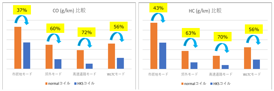 「SUPER FIRE RACING COIL PRO」がどの試験状況でもCOとHCの排出量が減少していることが確認できました。