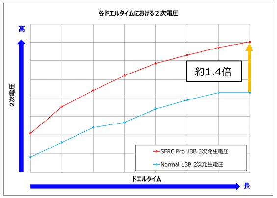 最大で純正比約1.4倍の2次電圧を発生いたします。