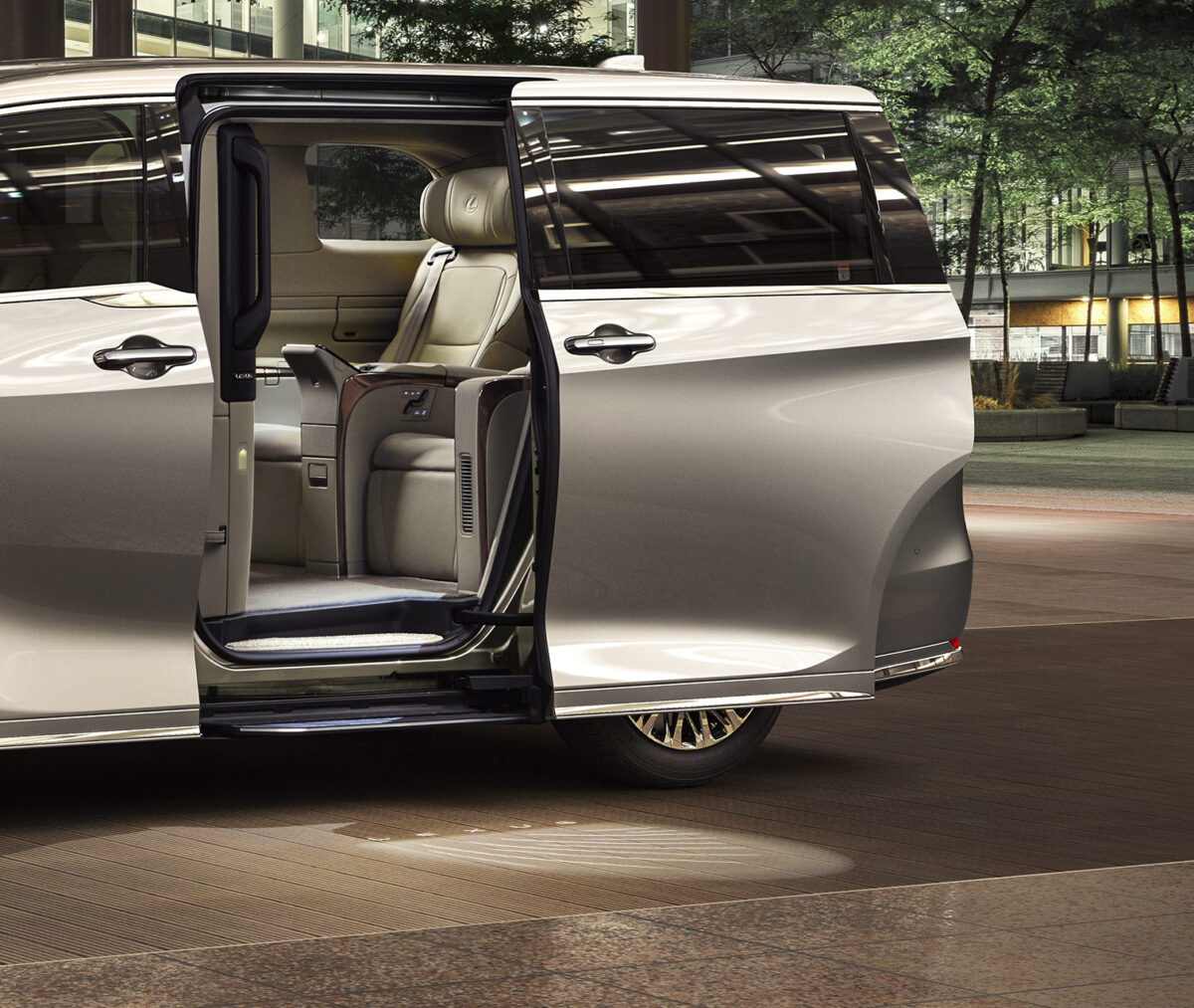 “EXECUTIVE”(4人乗り)において、スライドドアを開けたとき、路面を照らすスライドドアウェルカムイルミネーションを新たに採用。車内へ誘うような動きのあるイルミネーションで足元を照らすことで、安全性の向上に寄与するとともに、乗員をやさしく迎え入れるおもてなしを実現しました。