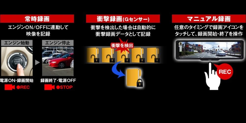 ドライブレコーダー機能搭載で、前方+後方同時にFull HD(1920×1080p)解像度の録画ができます。事故の記録としてだけでなく、ドライブや旅行の思い出を記録するのにも適したキレイな映像が楽しめます。