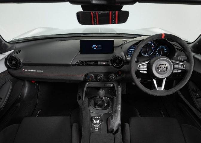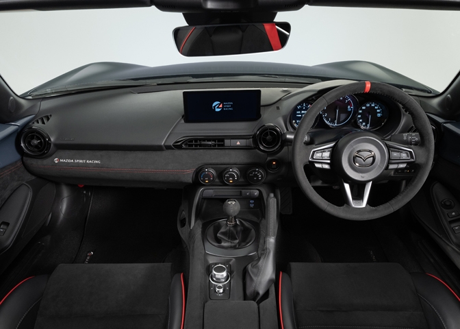 - 黒基調の内装にシートベルト、ステアリングトップマーク、ステッチ、シートパイピングに刺激的な赤いアクセントを施したMAZDA SPIRIT RACING専用内装。