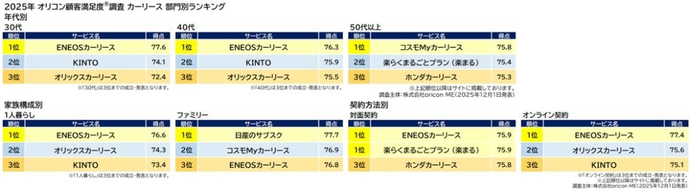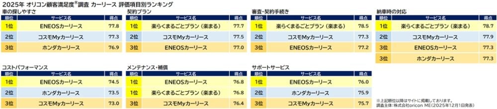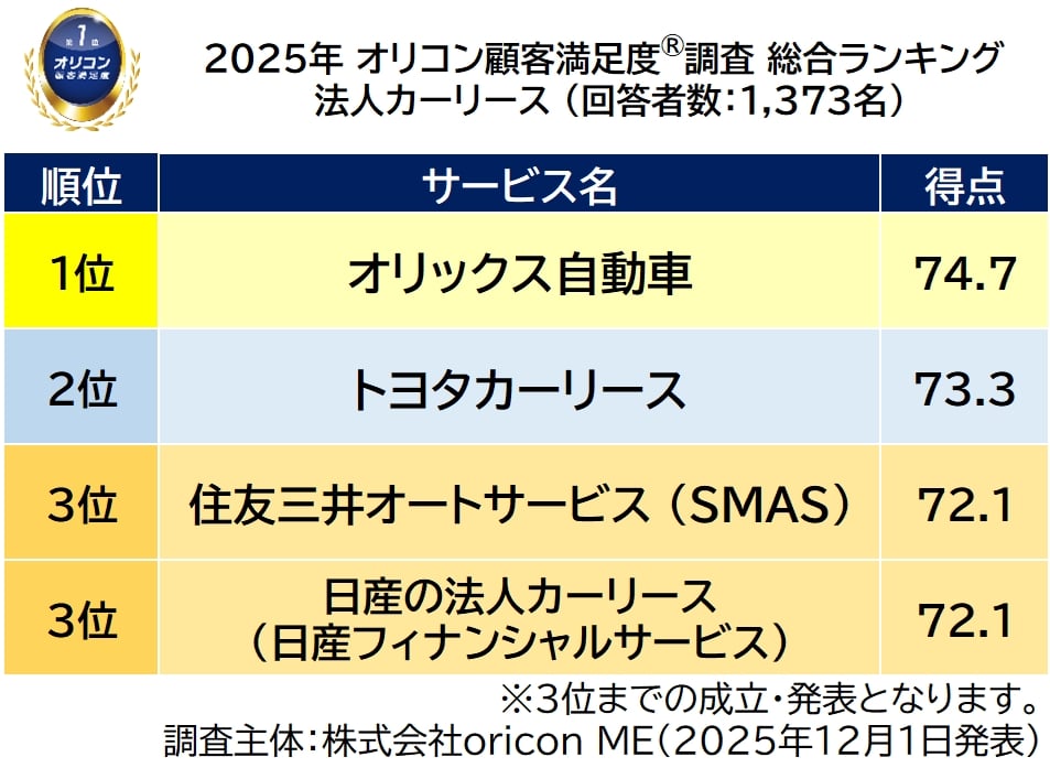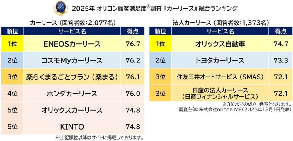 オリコン株式会社(本社:東京都港区 代表取締役社長:小池 恒、略称:オリコン)は、グループ会社である株式会社oricon MEが、実際のサービス利用者を対象に第三者の立場で実施した『カーリース』『法人カーリース』についての顧客満足度調査の結果を、2025年12月1日(月)14時に「オリコン顧客満足度®」公式サイト内にて発表いたしました。ランキングは以下の通りとなりました。