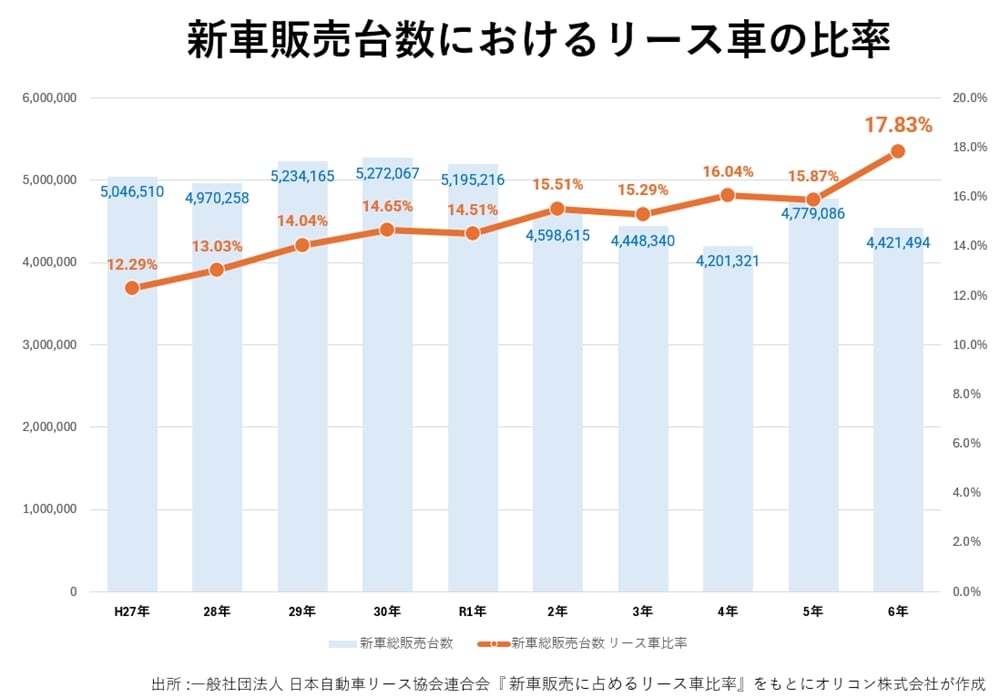 一般社団法人 日本自動車リース協会連合会が発表した「新車販売に占めるリース車比率」によると、新車販売台数におけるリース車の比率は17.83%で過去最多となりました。