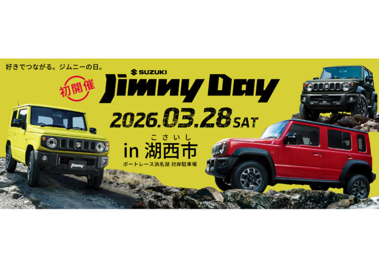 スズキ株式会社は、ジムニーユーザー向けイベント「SUZUKI Jimny Day in 湖西市」を2026年3月28日に静岡県湖西市のボートレース浜名湖対岸駐車場で開催すると発表した。