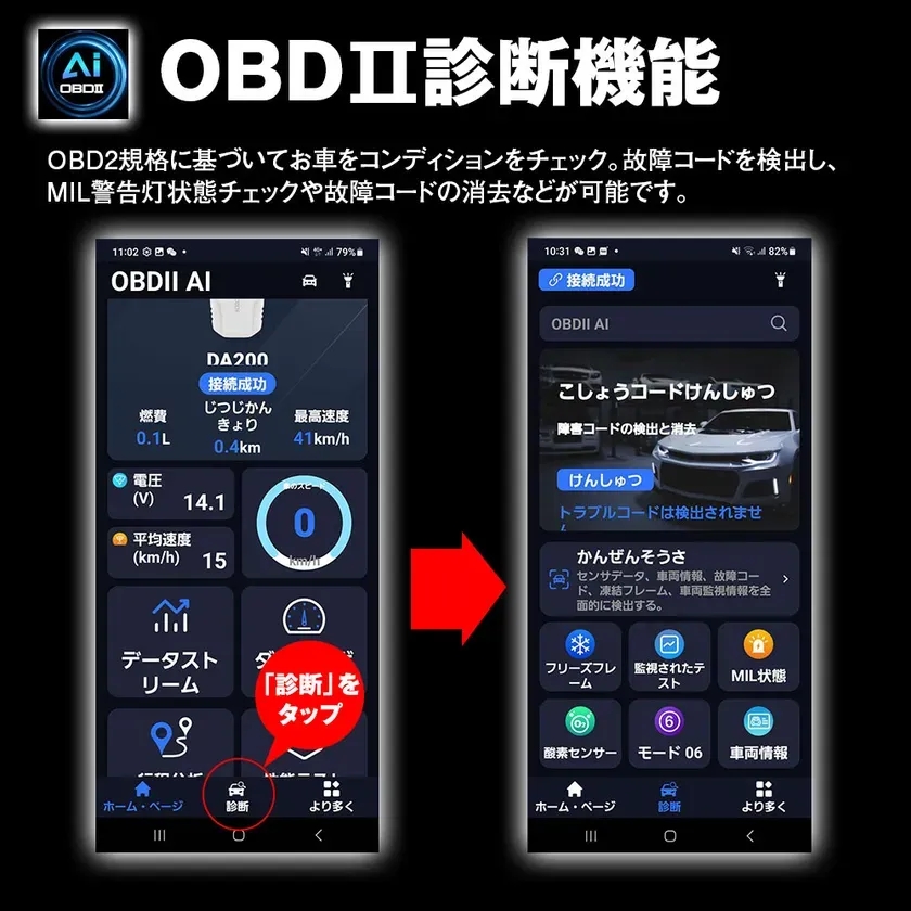 本製品の設置は非常に簡便である。車両のOBDIIポートに本体を差し込むだけで接続が完了し、その後Bluetoothでスマートフォンとペアリングする。専用アプリ「OBDII AI」はAndroidおよびiPhone(iOS)の両方に対応しており、日本語表示もサポートされているため、機械操作が苦手なユーザーでも直感的に利用できる設計となっている。
