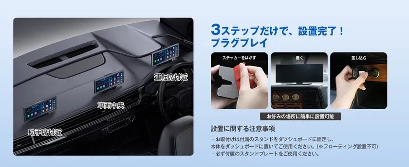 車載機器の取り付けは複雑で面倒という印象を持つユーザーも多いが、「ScreenFlow」はその懸念を解消する。設置はダッシュボードに付属の台座を貼り付け、電源ケーブルを接続するだけで完了する。専門知識や特別な工具、配線工事は一切不要であり、まさに「置くだけ」で導入できる手軽さが魅力である。設置後も、画面の角度をダイヤルで微調整できるため、日差しの反射や運転姿勢に合わせて最適な視界を確保できる。自動車の内装を加工することに抵抗があるユーザーや、賃貸物件のように原状回復が必要な場合でも、安心して導入できるアクセサリーと言えるだろう。