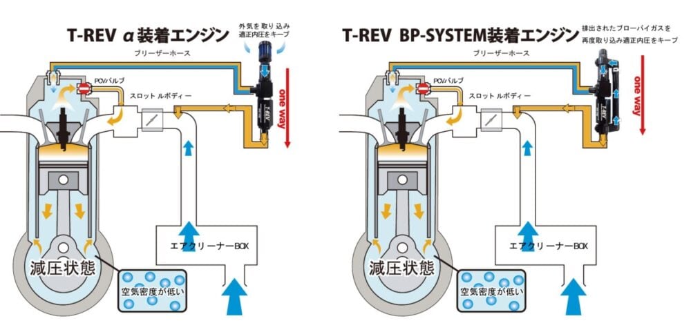 寺本自動車商会が開発した内圧コントロールシステムで2輪用として始まり、4輪用にチューニングされ開発された「T-REVαシステム」をベースに改良を加え、クランクケース内圧のさらなる安定化をさせるために「T-REV BP-SYSTEM」が誕生した。