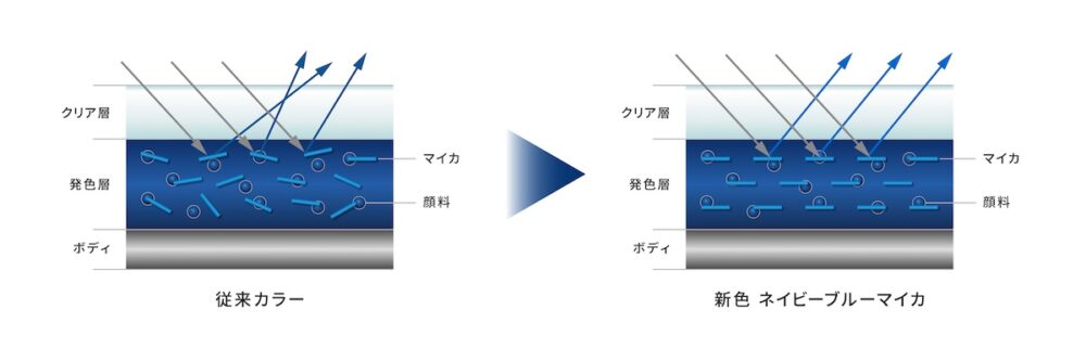 リリースによれば、ネイビーブルーマイカは「明るいところは鮮やかなブルー」に、そして「暗いところは深く美しいネイビー」に見える表現を徹底的に追求して開発されたといいます。