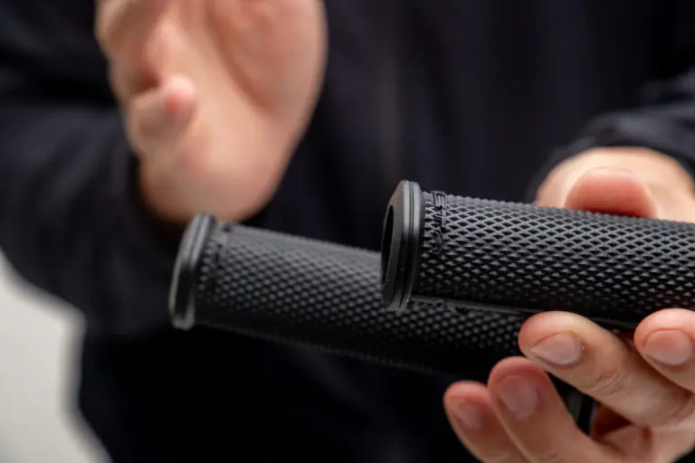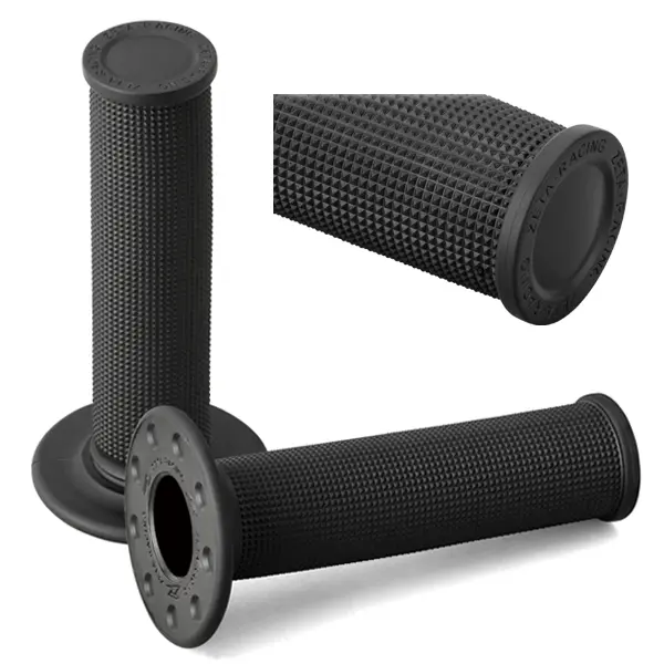 例えばZETAのレースグリップはベース部分にアンチスリップダイヤモンドパターンを採用し、指が当たる部分にワッフル状の突起を作っています(ハーフワッフル)。この突起があることで手が疲れたりグリップが濡れて滑りやすくなっても指が外れにくくなっています。さらに、柔らかく衝撃吸収性の高いコンパウンドを握る部分に採用することで振動などによる疲労を軽減したり、バーエンドやドーナツのカラー部分に耐久性の高いコンパウンドを使用することでグリップ自体の寿命を延ばしています。