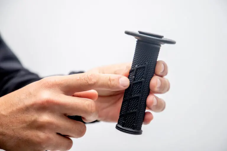 次にZETAのベースグリップです。こちらはフルダイヤと呼ばれる形状で、指が引っかかるワッフルがなく、細さに特化したグリップと言えます。そのため、少ない力でしっかり握ることができます。JNCCで活躍する馬場大貴選手をはじめ、モトクロス出身のライダーに好んで使われる傾向があります。