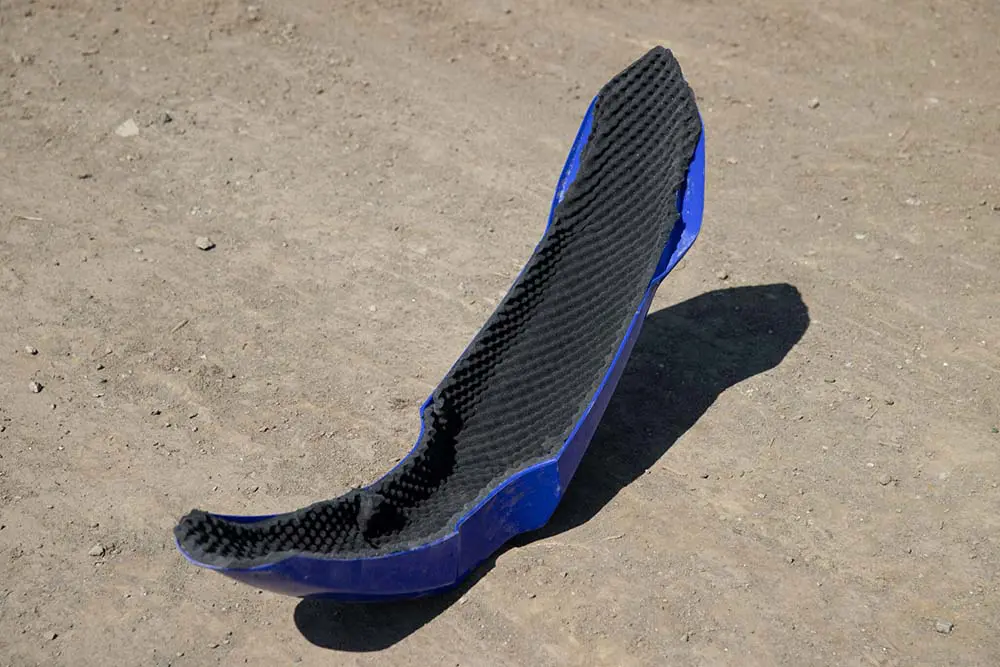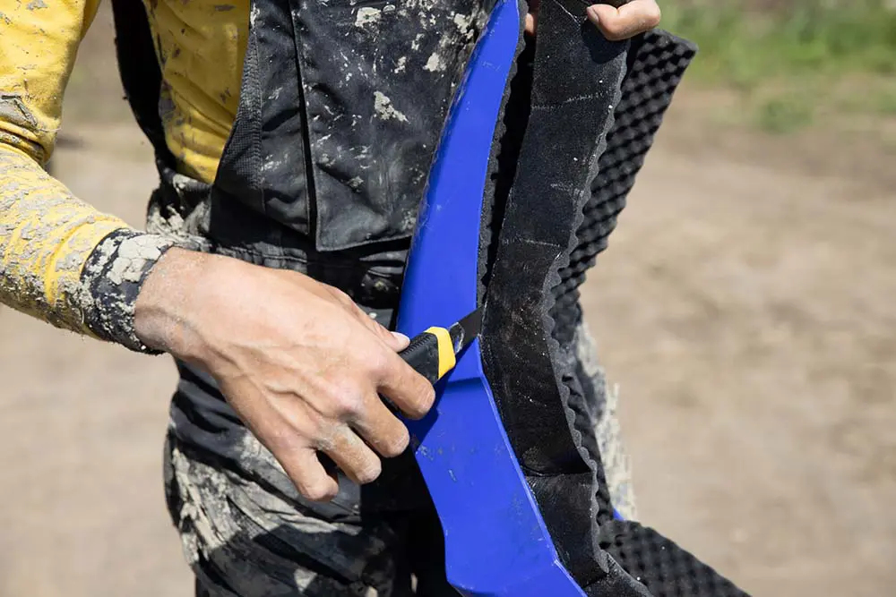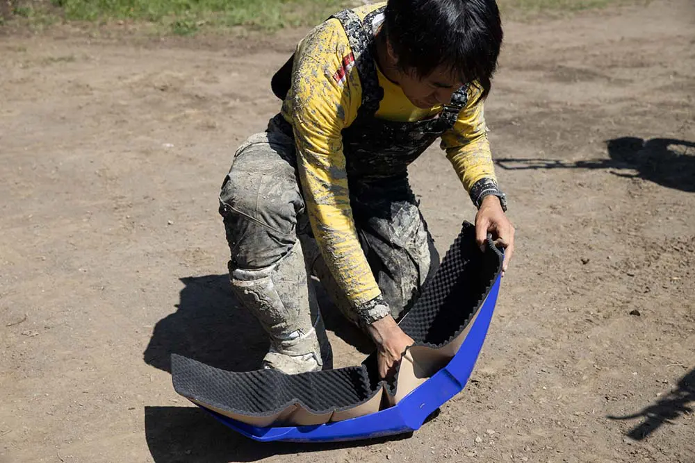 切れ端は外装などに余すことなく使用します。前方から泥を受けるサスペンション付近も、多くのライダーが保護している部分。