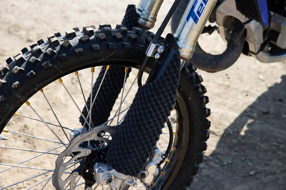 フェンダー裏は一番多く泥がつく部分。走行中にはねた泥がフェンダー裏に付着し、走行後に見てみると泥がたっぷり詰まっています……。また、かなりひどい状態になると、タイヤとフェンダーの間に泥がつまってホイールが回転しにくくなるなんてことも。全日本モトクロス選手権IA1クラスを走る能塚智寛選手のマシンを見てみると、フェンダー裏にスポンジ(フェンダーマット)が貼り付けてあります。やはり定番カスタムなのですね。