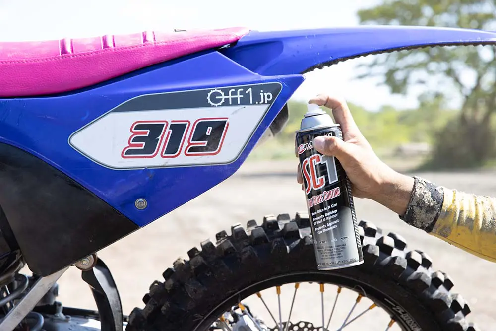 また、撥水効果があるシリコンスプレーを吹きかけることで泥の付着を軽減します。外装やタイヤなど、マシン全体に吹きかけていきます。