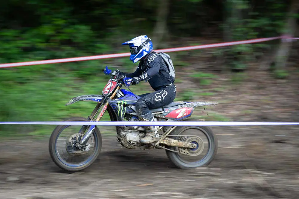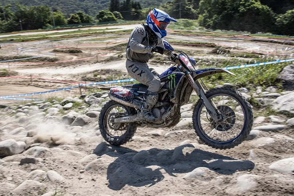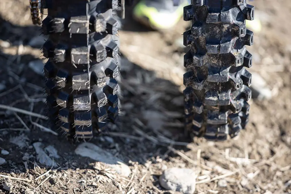 FIM規格の黎明期は、その性能が低く、モトクロスタイヤのほうが圧倒的にグリップしたのですが、技術が進んだ今、一概にそうとも言えない状況に。特にエルズベルグロデオでヒアリングすると、ただコンパウンドが柔らかいだけのガミータイヤ(岩場などでグリップしやすいように極端な柔らかさのゴムをつかったもの)はダメだと一様に口にするほど。